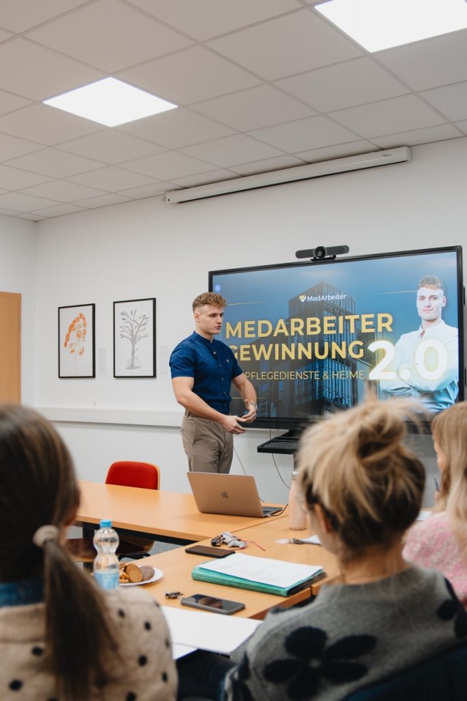 Am Montagmorgen fand dazu ein persönlicher Austausch in Chemnitz statt. Vor 15–20 leitenden Mitarbeitendern der Heimaufsicht Sachsen hielt einer unserer Geschäftsführer Florian Ngjela einen rund 45-minütigen Fachvortrag, begleitet von einer anschließenden Fragerunde. Ziel des Treffens war es, unsere Arbeitsweise kennenzulernen und zu verstehen, wie wir Pflegeeinrichtungen dabei unterstützen, nachhaltig und kosteneffizient Personal zu gewinnen – als Alternative zu Zeitarbeit und klassischer Personalvermittlung.